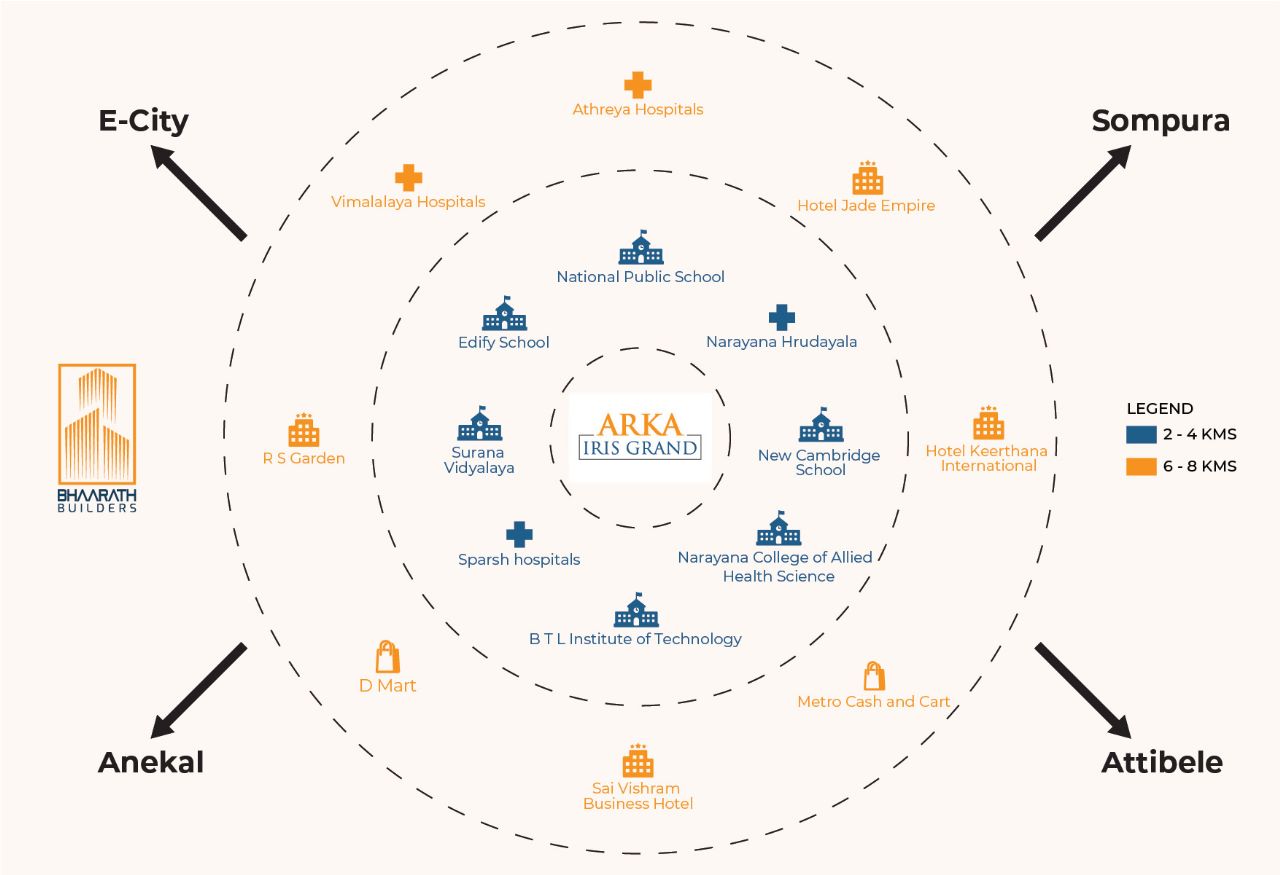 As a gated community apartment in Bangalore,Arka Iris Grand is located in a prime neighbourhood that gives you easy access to a multitude of landmarks. Consider your basic needs to be covered by living in such a prime location which has schools for your kids, fantastic shopping complexes, hotels and restaurants for all your daily and not so daily needs.